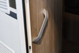 Deze zilverkleurige handgreep is een praktische toevoeging bij de instap van de camper. De beugel biedt extra steun en houvast bij het in- en uitstappen via de camperdeur.