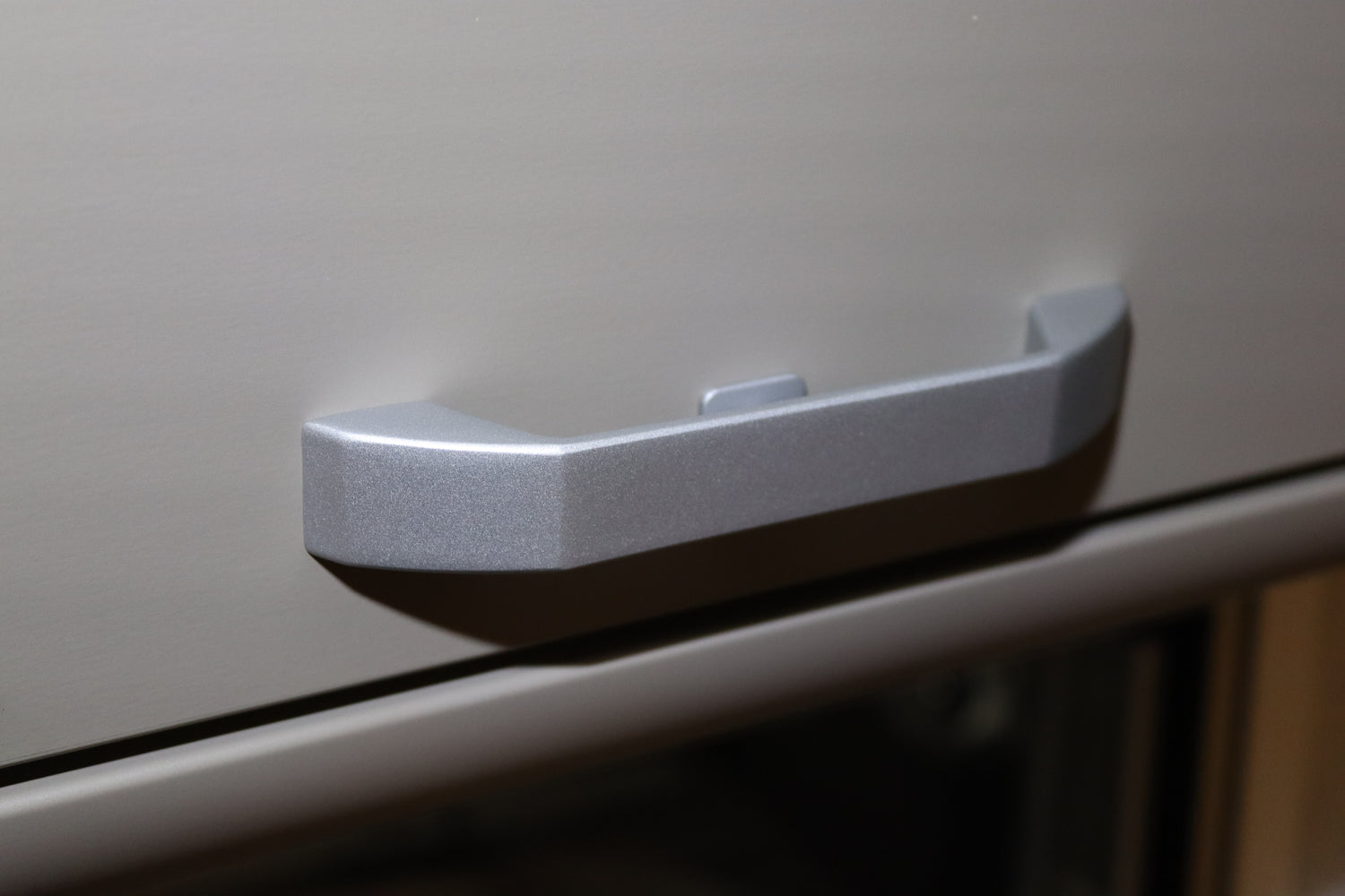 Dit is het originele vervangingsonderdeel voor de bovenkasten in Carado campers. De handgreep is uitgevoerd in een zilvergrijze kleur en komt exact overeen met de fabrieksstandaard.