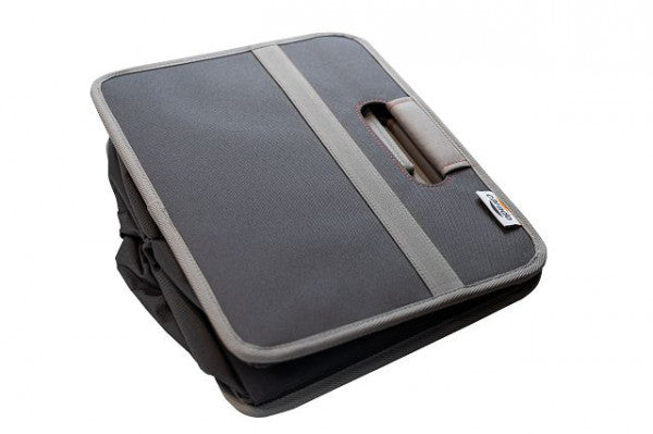 Wanneer de uittrekbare lade niet in gebruik is, kan elke Carado-box in een handomdraai worden opgevouwen en ruimtebesparend worden opgeborgen. Indien nodig kunnen drie eenvoudige handgrepen de smalle tas weer in een grote doos veranderen, die bovendien met een elastische band kan worden vastgezet.