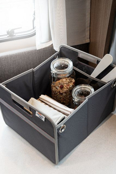 De opvouwbare opbergdozen in het kenmerkende Carado-design zijn uiterst praktisch en veelzijdig. Ze kunnen worden gevuld met alle benodigdheden voor thuis en dankzij de gewatteerde handgrepen gemakkelijk worden vervoerd. In de camper kunnen de dozen eenvoudig worden opgehangen in de uittrekbare lade onder de gootsteen – waardoor vervelend herschikken overbodig is.