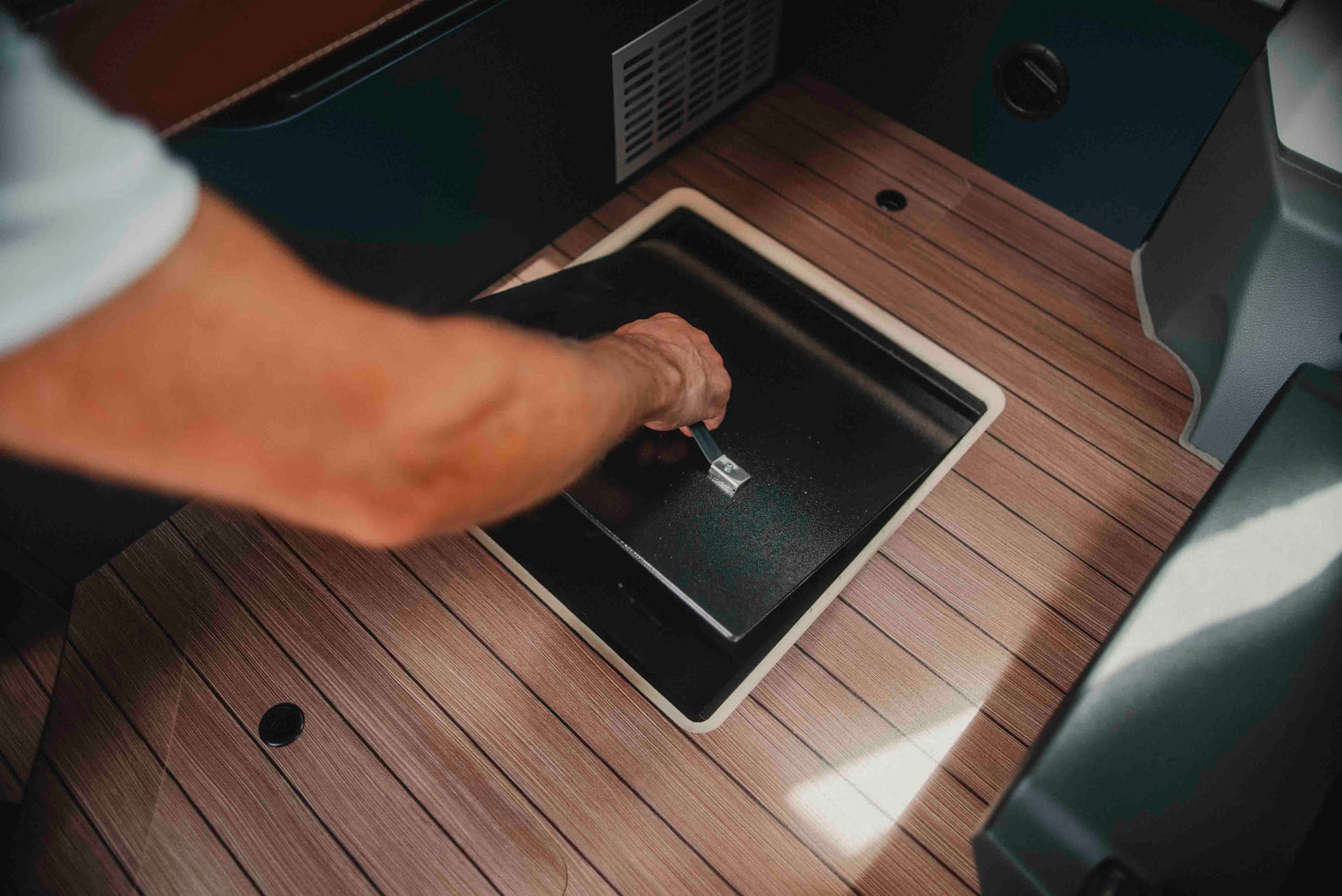 De 6 mm stalen deur is voorzien van een verzonken handgreep, waardoor de vloerplaat van de camper vlak blijft sluiten. Een rubberen inlegmat voorkomt krassen op je spullen en gaat rammelen tijdens het rijden tegen.