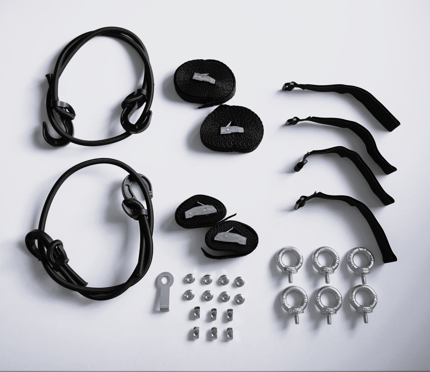 Dit is een praktische set voor het vastzetten van bagage in de garage of opbergruimte van de camper. Met deze onderdelen creëer je eenvoudig extra bevestigingspunten om spullen veilig op hun plek te houden tijdens het rijden.