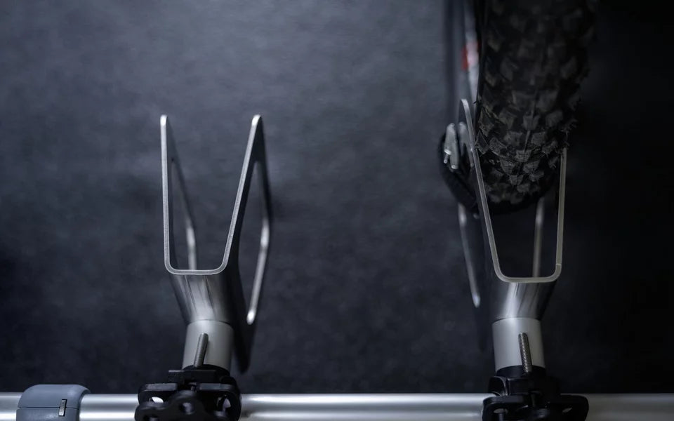 De fietsen worden eerst in de voorste klembeugels geschoven - de fietsen staan dus al op zichzelf. Dit maakt het gemakkelijker om de fietsen vast te zetten met behulp van de bevestigingsarm, en de fietsen kunnen gemakkelijk en stevig worden vastgezet voordat ze vertrekken.