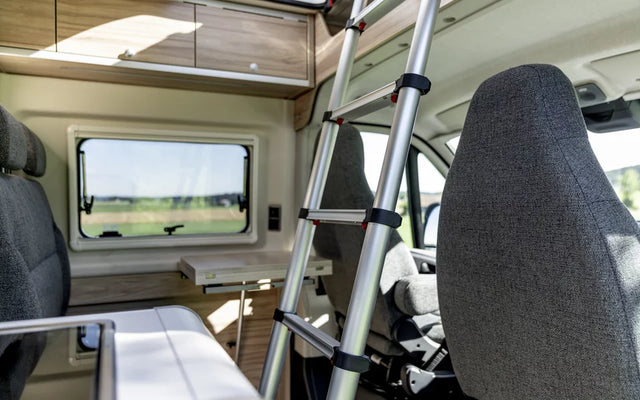 De HYMER telescopische ladder is de perfecte aanvulling op je pop-top dak. De 7 sporten zorgen voor een gemakkelijke toegang tot het slaapgedeelte. Als de ladder niet nodig is, kan hij tot 750 mm worden ingeklapt en veilig worden opgeborgen.